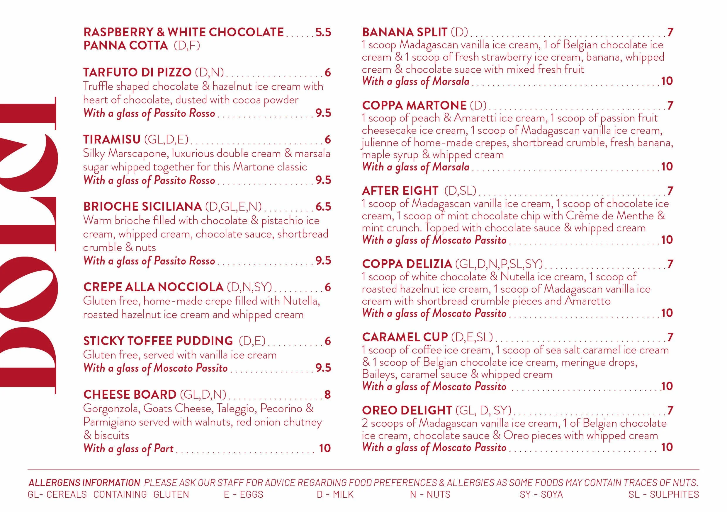 C - CELERY GL- CEREALS CONTAINING GLUTEN CR - CRUSTACEANS E - EGGS F - FISH L- LUPIN D - MILK M - MOLLASCS N - NUTS P - PEANUTS SES - SESAME SEEDS & OILS SY - SOYA MUS - MUSTARD SL - SULPHITES